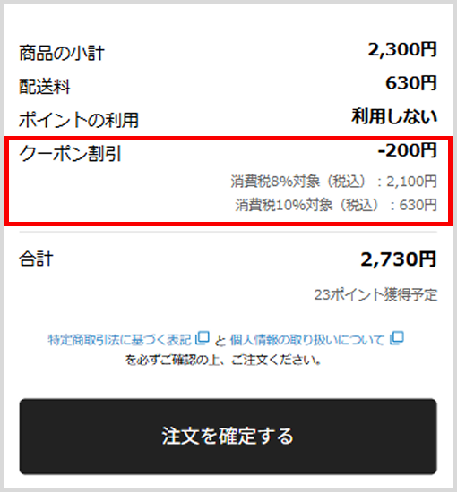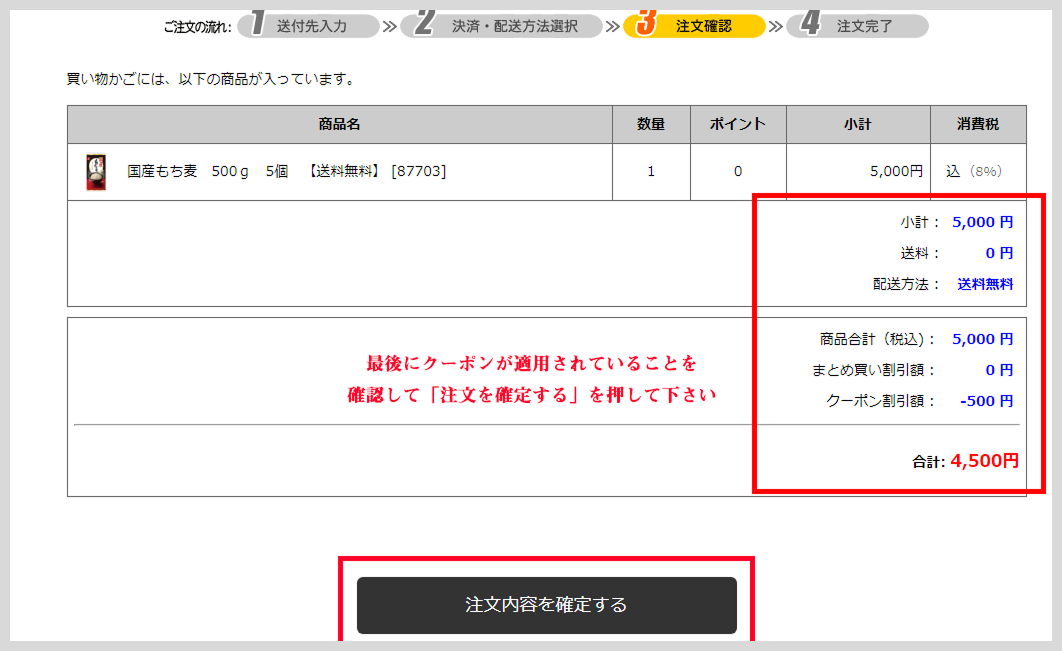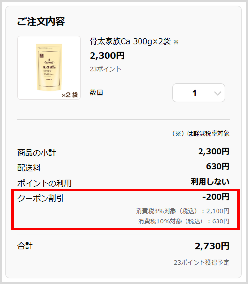 3.正しくクーポンコードが入力されると「ご注文内容」の画面のクーポン割引額に反映されます。