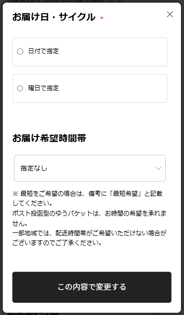 対象商品の商品ページの を押して買い物かごに追加します。ご注文画面からお届け日・サイクルを選択してください。 1.「お届け日時を選ぶ」の青いボタンをクリックします。 ![]() 2.ご希望の日時を選択し、「この内容で変更する」ボタンをクリックします。 ![]() |